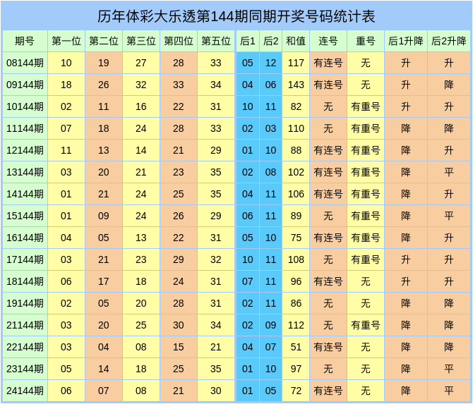 和值分析:在历史同期开奖中,前区和值出现范围在51-143之间,区间内的最大波动差值为92,其中大数和值开出频次较高,共出现了9次,当前小数和值开出了7年,今年同期预计和值继续走小。
