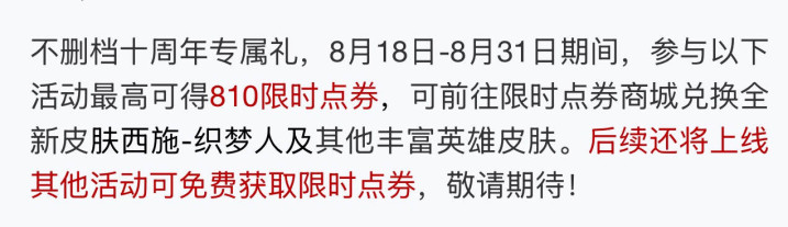 大家有没有注意到这个公告,这个公告是后续官方还会推出其他活动,同样也可以免费获取限时点券,所以想要白嫖孙悟空地狱火的玩家,这次的限时点券就先别乱花,可以存好,等待后续活动上架之后,一起兑换哦!