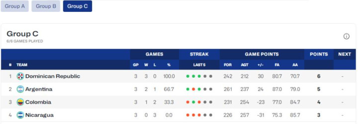 多米尼加男篮小组赛3胜0负积6分,力压2胜1负积5分的阿根廷男篮,多米尼加男篮以C组第一晋级八强。