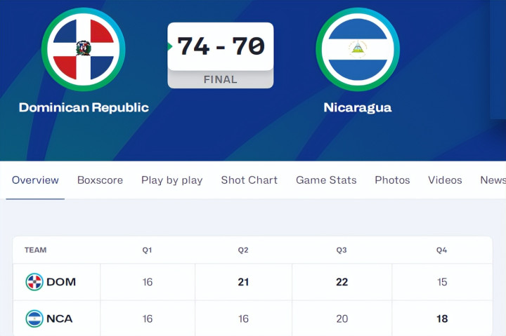 多米尼加男篮第二节21-16净胜5分,第三节22-20净胜2分,前三节比赛扩大59-52领先尼加拉瓜男篮。末节比赛,双方均是单节不足20分,多米尼加男篮遭遇顽强反扑单节15-18被追回3分,最终多米尼加男篮74-70险胜拒绝被逆转收获3连胜。