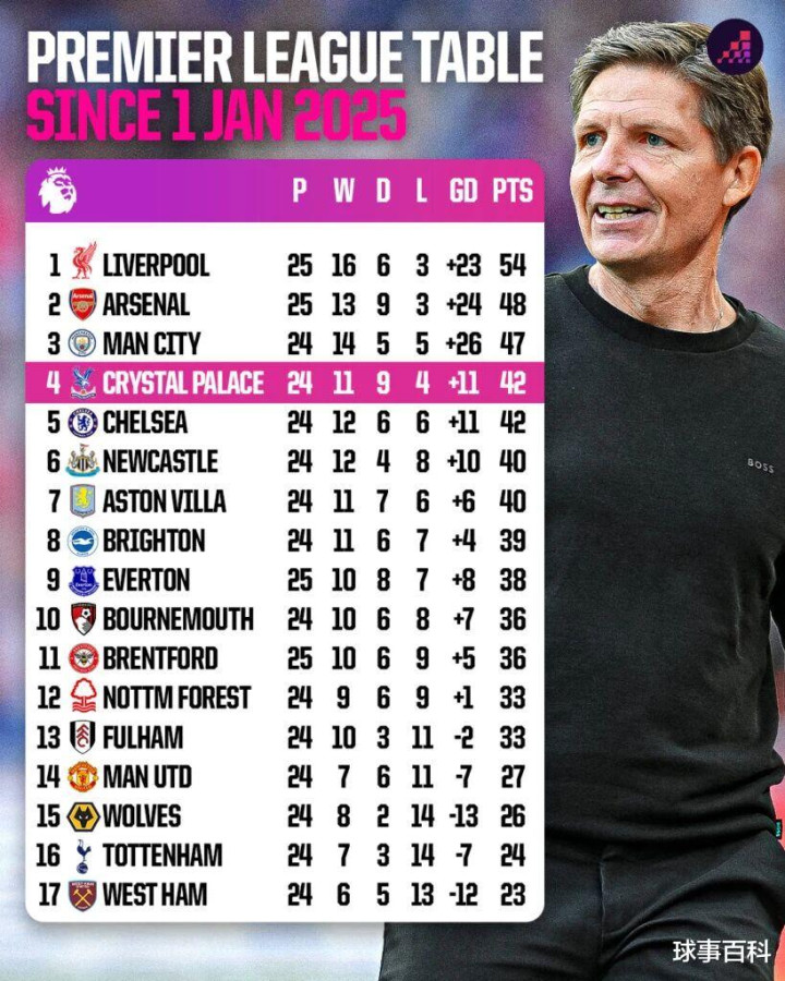 据统计,自今年1月以来,水晶宫在英超的拿分效率排名第4,仅次于利物浦、阿森纳、曼城。过去38轮,水晶宫拿到了59分,已逼近帕杜时代队史单季英超最高纪录(63分)。而63分在过往四个赛季里两次足以排名第六——那将是俱乐部现代史上的巅峰。