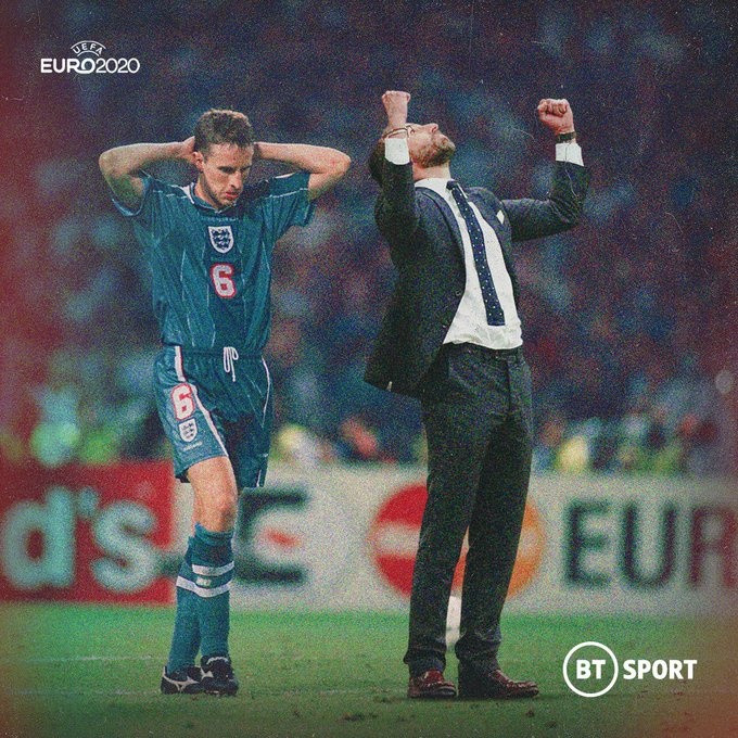 那个夜晚,在温布利球场的灯光下走向点球点时,索斯盖特一直在想:如果我踢丢了点球怎么办?比赛结束后,在更衣室里,他破碎且无法被安慰。接下来的二十年里,那次“创伤性”和“改变人生”的丢点成为一直萦绕他的梦魇,他在公共场合常常被介绍为“那个罚丢点球的人”,一个替罪羊。一个失败者。