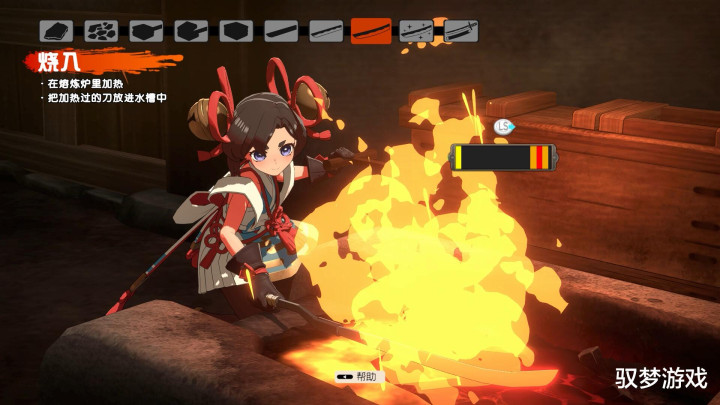 局外养成系统是本作的另一大特色。其中,“锻刀” 玩法尤为引人注目,玩家需严格按照日本刀的锻造过程,从冶炼玉钢到覆土烧刃,每一步都影响着最终刀具的属性。此外,玩家还可以使用萤石强化角色的剑职基础能力,让神乐职学习更多技能,通过消耗矿石购买碑文,打造专属 Build。