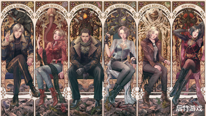 这张照片在30周年庆的网站发表,整体风格偏美型。我们看到了里昂、克莱尔、克里斯、吉尔、格蕾丝以及艾达·王,他们各自坐在王座上,身后各有一只生化系列的标志怪物,都是这些主角曾经面对的,有舔食者、追迹者、X先生等。