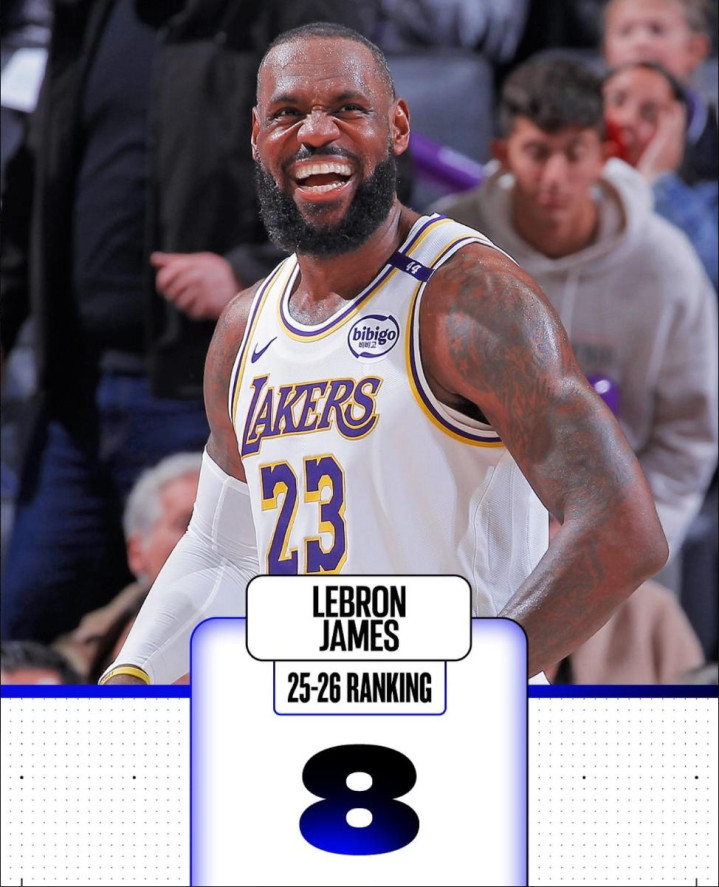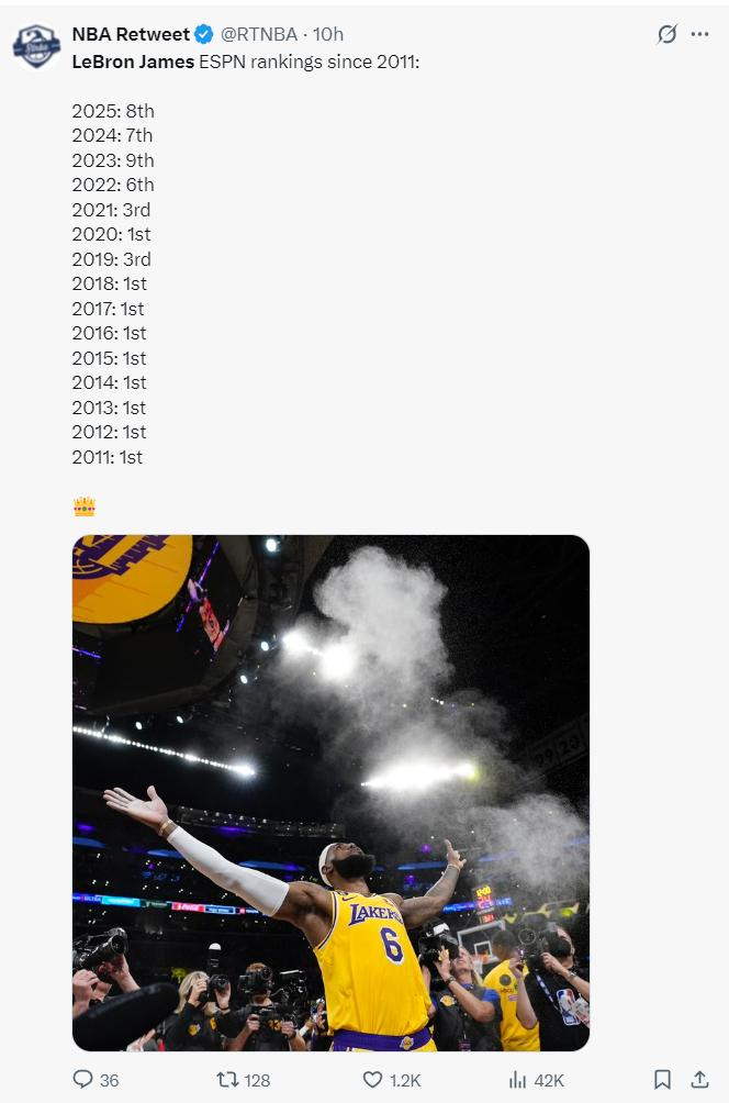 美媒更是晒出2011年-2025年勒布朗-詹姆斯在ESPN中的排名,2011-2018都是第一,2019是第三,2020年重返第一,随后2021-2025分别是:3、6、9、7、8,一直都没有跌出过联盟前十。
