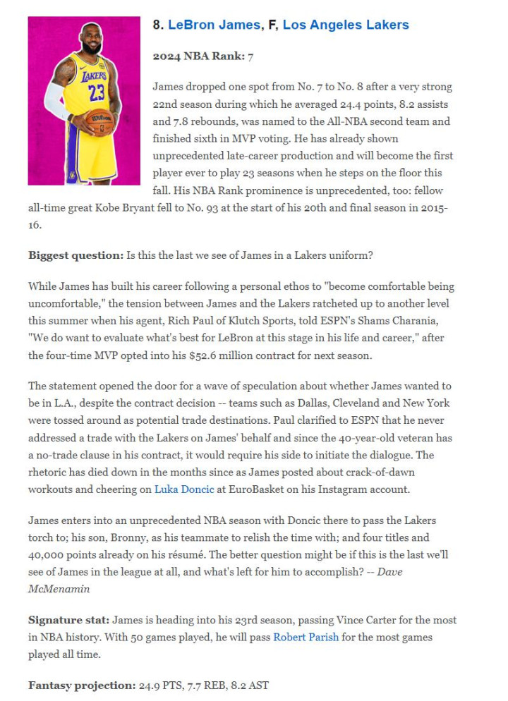 ESPN写道:40岁詹从去年的第七下滑到今年的第八,他22个赛季依旧出色,场均24.4分8.2助攻7.8篮板入选最佳二阵,MVP投票排名第六。他将成为历史首位进入23个赛季的球员,要知道15-16赛季最后一个赛季的科比仅仅排在联盟第93位。最大的问题是:这是我们最后一次看到勒布朗穿湖人球衣吗?