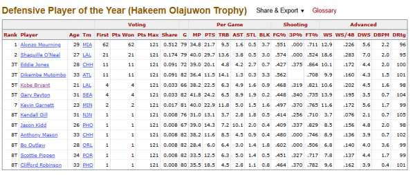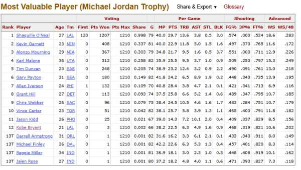99-00赛季的MVP排名相对来说,比较公正,科比排在第12位,前十一名是奥尼尔、加内特、阿隆佐-莫宁、卡尔-马龙、蒂姆-邓肯、加里-佩顿、阿伦-艾弗森、格兰特-希尔、克里斯-韦伯、文斯-卡特、贾森-基德。
